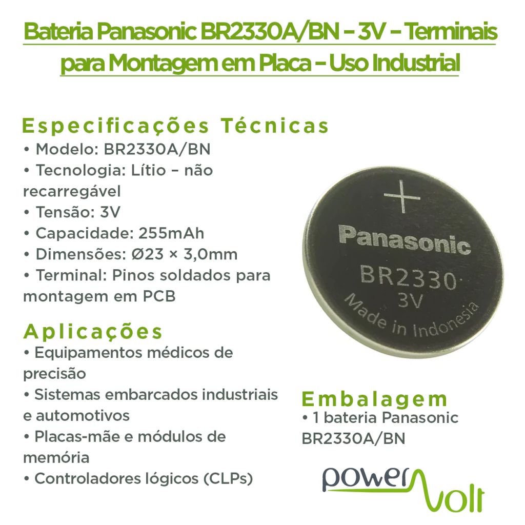Bateria de lítio Panasonic BR2330A/BN, desenvolvida para aplicações industriais e eletrônicas que exigem alta confiabilidade e longa vida útil. Ideal para equipamentos médicos, sistemas embarcados, placas-mãe, equipamentos de medição e controladores industriais.