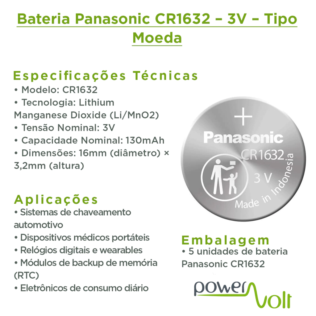 A Panasonic CR1632 é uma bateria de lítio tipo moeda, compacta e de alta eficiência, ideal para aplicações que exigem energia confiável e longa duração. Com tensão nominal de 3V e capacidade aproximada de 130mAh, oferece excelente desempenho em dispositivos eletrônicos portáteis. A cartela com 5 unidades proporciona praticidade e ótimo custo-benefício para reposições frequentes.