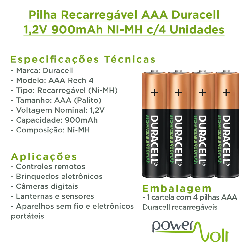 A Pilha Recarregável AAA Duracell oferece energia duradoura e sustentável para seus dispositivos eletrônicos. Com tecnologia Ni-MH (Níquel-Metal Hidreto), é ideal para quem busca economia e desempenho, permitindo centenas de recargas sem perda significativa de capacidade.
